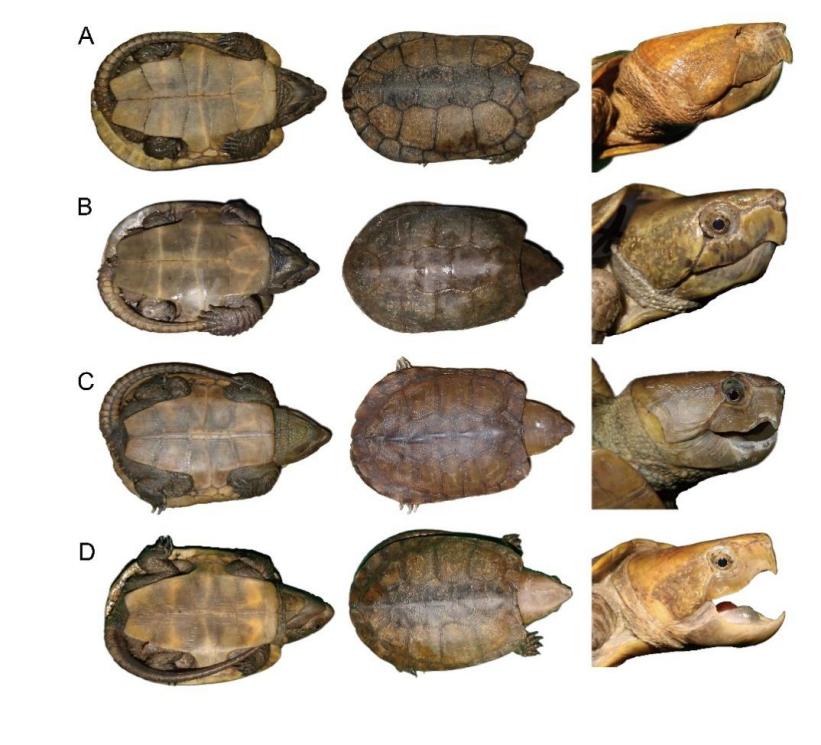 研究结果表明:平胸龟指名亚种(P. m. megacephalum)与缅甸亚种(P. m. peguense)代表了两个深度分化的进化谱系,应分别认定为两个独立种:平胸龟(Platysternon megacephalum Gray, 1831,狭义种)(图3)与缅甸平胸龟(Platysternon peguense Gray, 1870)(图4)。平胸龟越南亚种(P. m. shiui)的分类地位不成立,其实际属于P. m. megacephalum的次异名。此外,本研究还发现在广西百色-河池地区存在一支此前未曾发现的高度分化的新谱系,并将其描述为新种——百色平胸龟(Platysternon baiseensis sp. nov.)(图1、图5)。