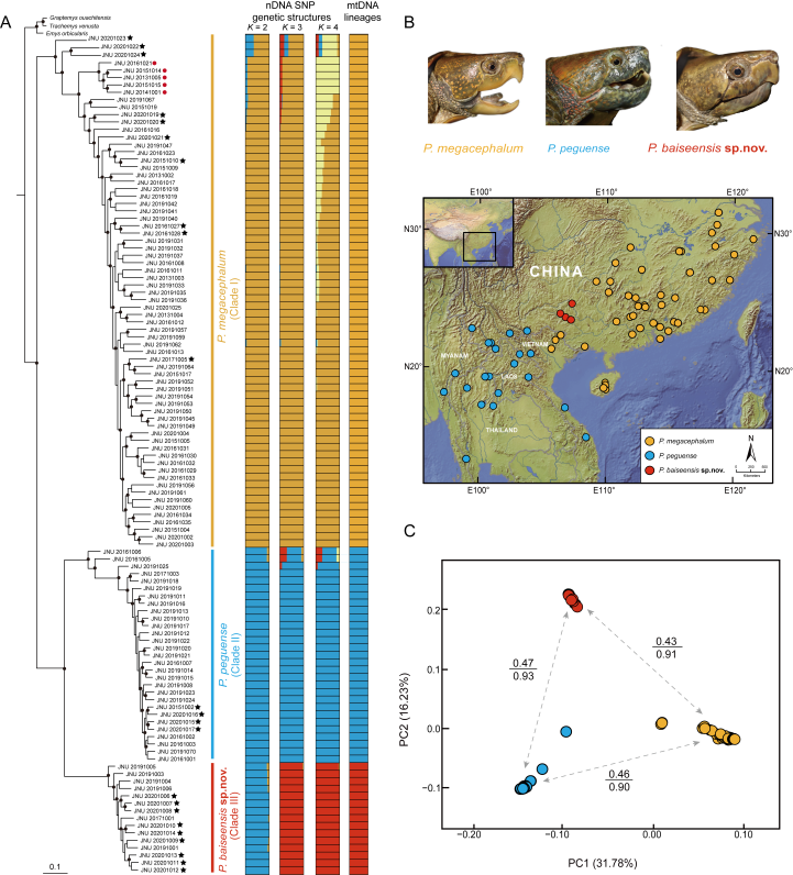 平胸龟科(Platysternidae)是龟鳖目中一个形态独特的单型科,长期以来仅包含平胸龟(Platysternon megacephalum)一个物种,俗称“大头龟”或“鹰嘴龟”,分布于中国、越南、缅甸、泰国、老挝、柬埔寨等亚洲国家。该物种因长期盗猎、非法贸易和栖息地破坏导致种群急剧下降,被世界自然保护联盟(IUCN)评为极度濒危物种(CR),并被列入濒危野生动植物种国际贸易公约(CITES)附录Ⅰ及中国国家重点保护野生动物名录(II级),凸显了加强平胸龟科物种保护的紧迫性和重要性。然而,长期以来,平胸龟科物种的系统发育关系和谱系地理格局不明确,系统分类长期存在争议,制约了该濒危动物类群的科学保护与管理。
