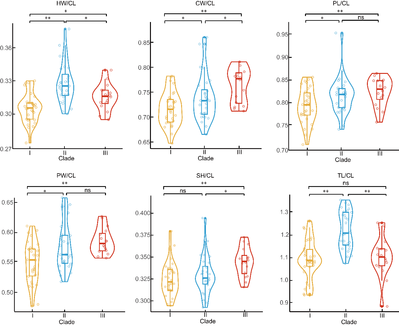 箱图中的水平线代表中位数,箱体包含第75和第25百分位数;圆点表示各样本的数值(clade I平胸龟有32个样本,clade II缅甸平胸龟有28个样本,clade III百色平胸龟有16个样本)。ns:无显著差异。*:P < 0.05;**:P < 0.01。