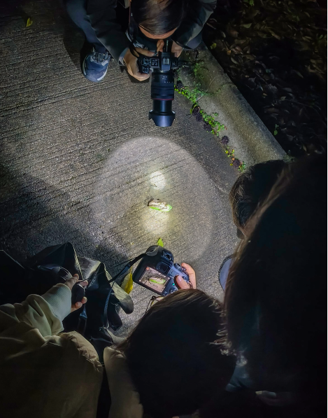 夜幕降临,车八岭的森林愈显神秘。晚上九点,队员们整装出发,深入保护区开展夜观考察。溪流边、草丛中,两栖和爬行动物悄然出没。大家仔细观察、拍照记录,积累夜间生态数据,为保护区物种鉴别分类和环境监测提供补充。从去年的数据采集,到今年的持续监测,科研链条在坚持和探索中不断延伸,构成数字模型的基础也愈发坚实。